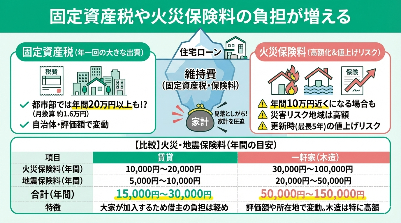 住宅ローンの支払いに意識が集中しがちですが、実際には固定資産税や火災保険料の維持費が家計を圧迫し、生活に余裕がなくなるケースも少なくありません。