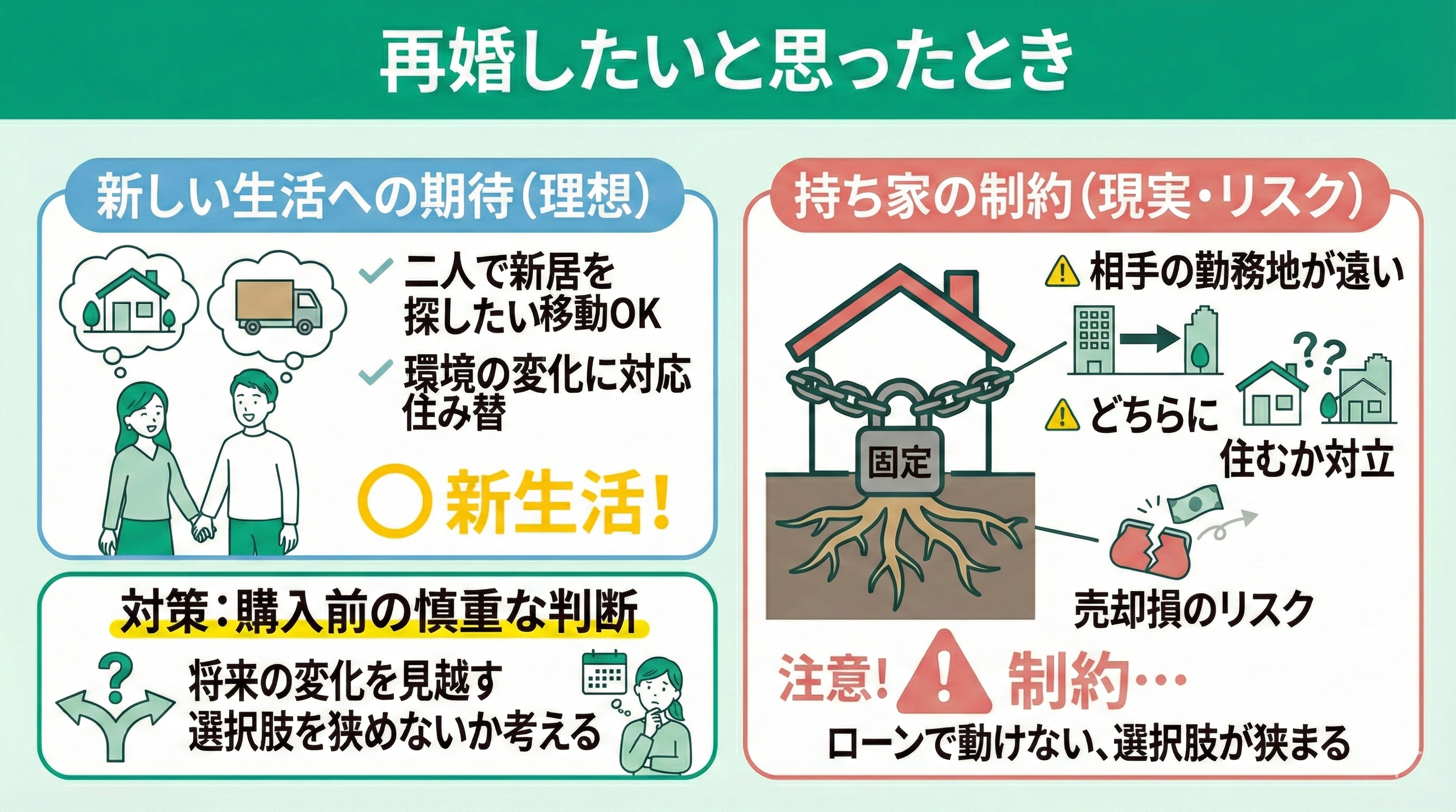 たとえば、再婚相手の勤務地が遠ければ引っ越しが必要になりますが、住宅ローンが残っているとすぐに売却できず、思うように動けません。仮に売れたとしても、市場価格によっては損をする可能性があります。