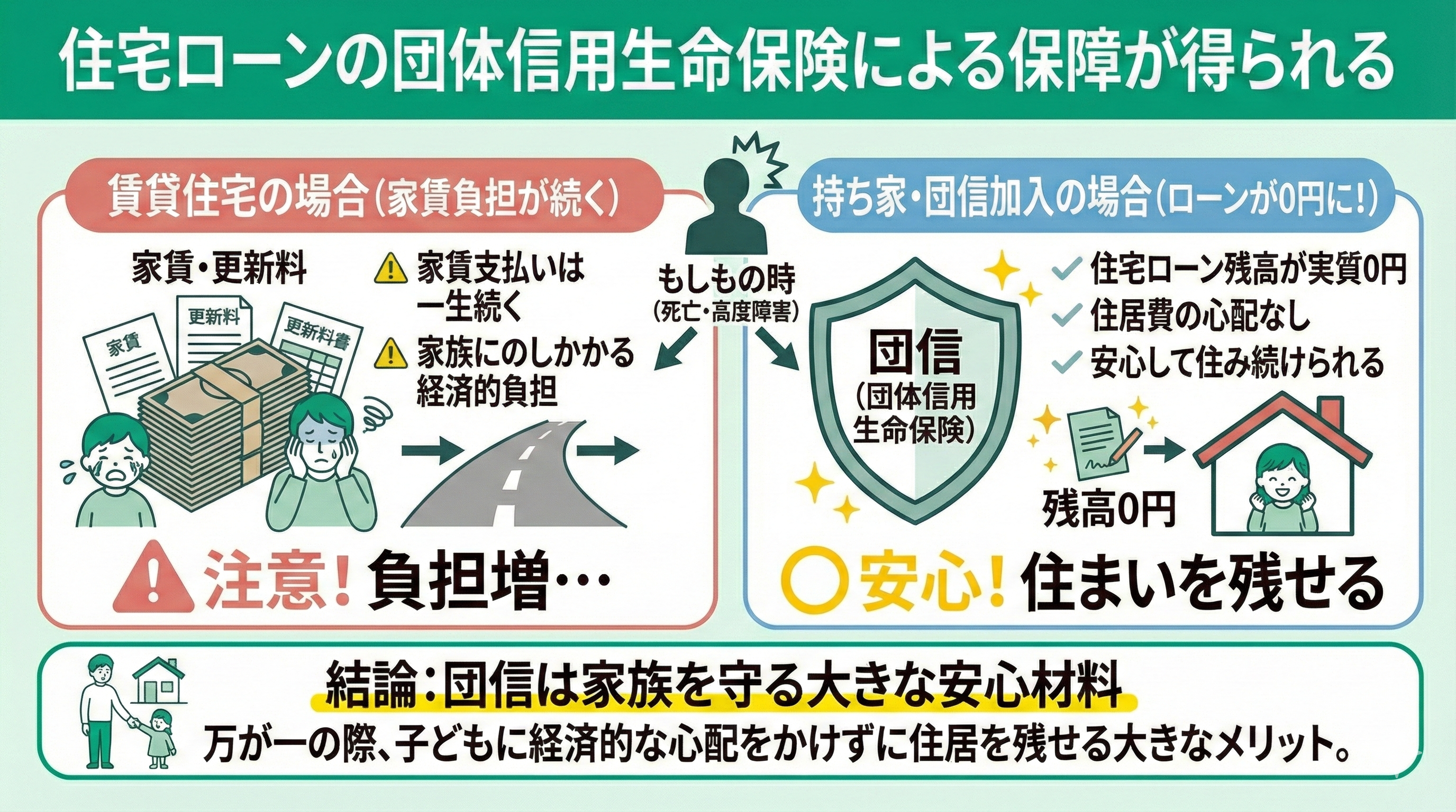 しかし、持ち家なら団信によってローンの支払いがなくなり、子どもたちは経済的な心配をせずに住み続けることができます。