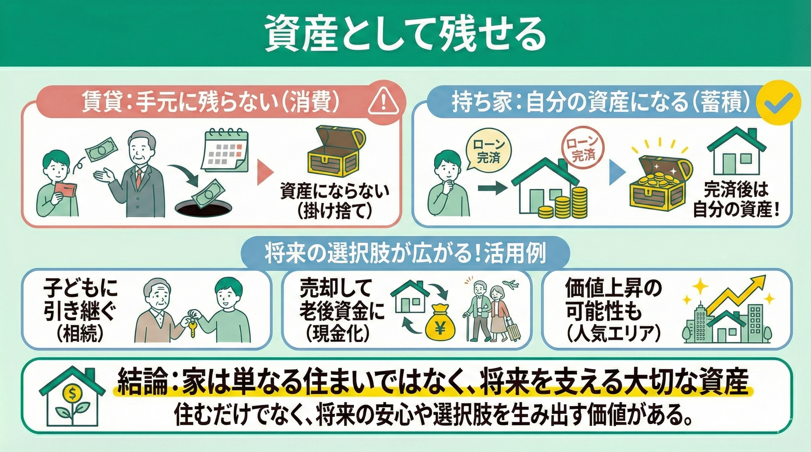 子どもに引き継ぐこともでき、売却すれば老後資金として活用することも可能です。人気エリアの物件なら、将来的に価値が上がる可能性もあります。