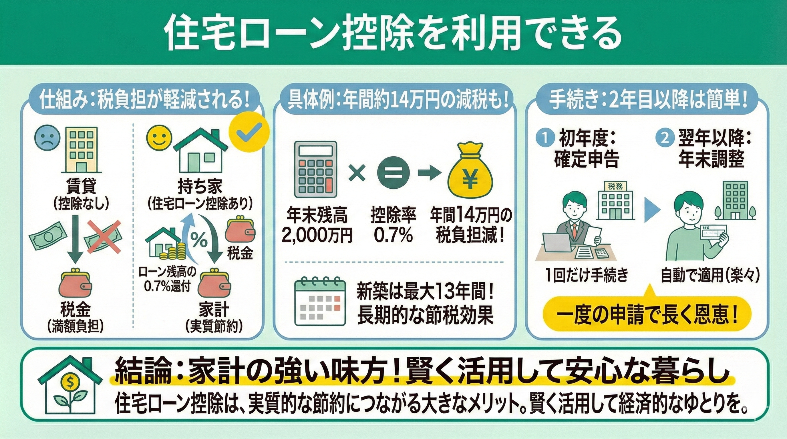 たとえば、年末時点のローン残高が2,000万円なら、控除率0.7%で年間14万円の税負担が軽減され、新築の場合は最大13年間(2026年2月時点)の節税が可能です。