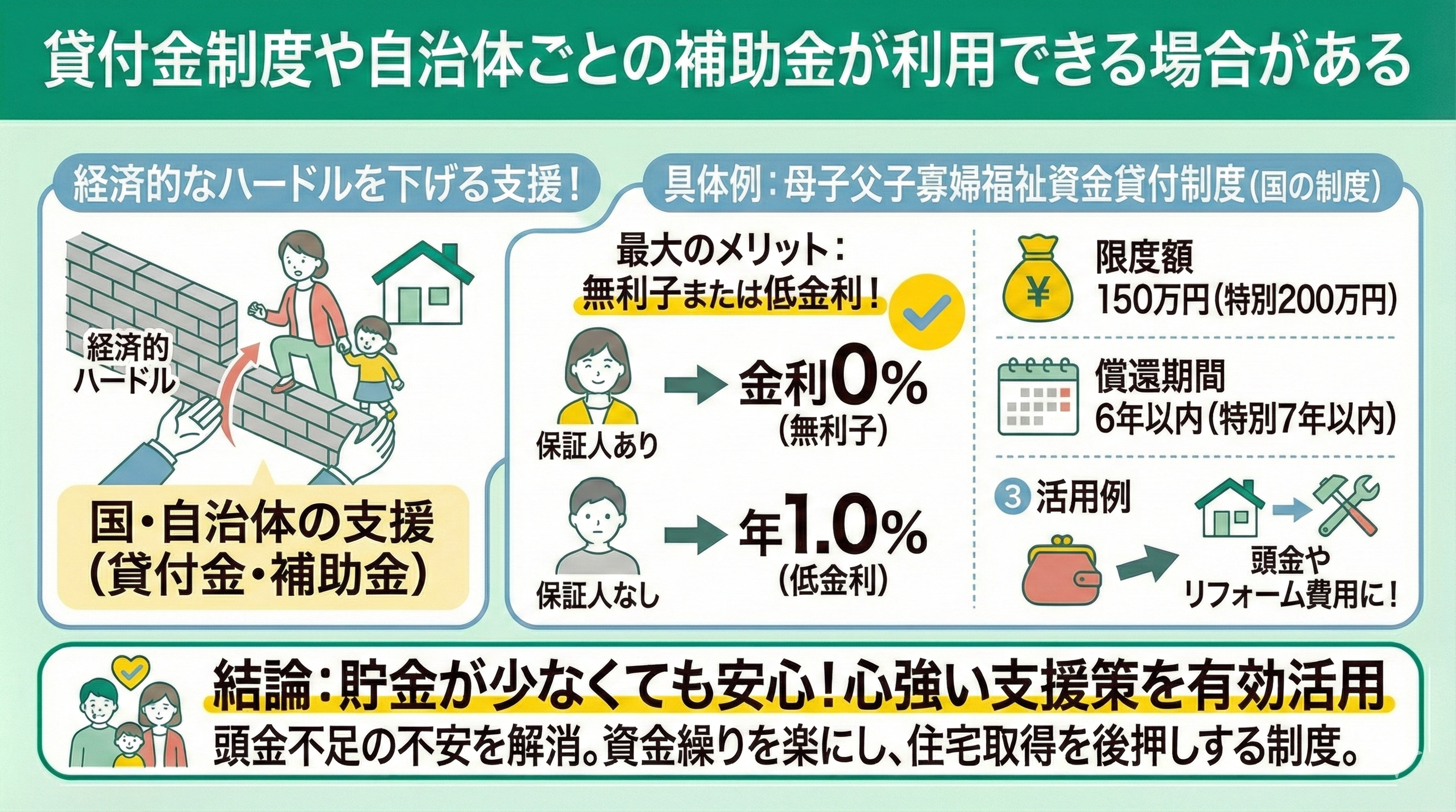 母子父子寡婦福祉資金貸付制度を活用すれば、頭金やリフォーム費用の一部を無利子で借りられるため、資金のやりくりがしやすくなります。