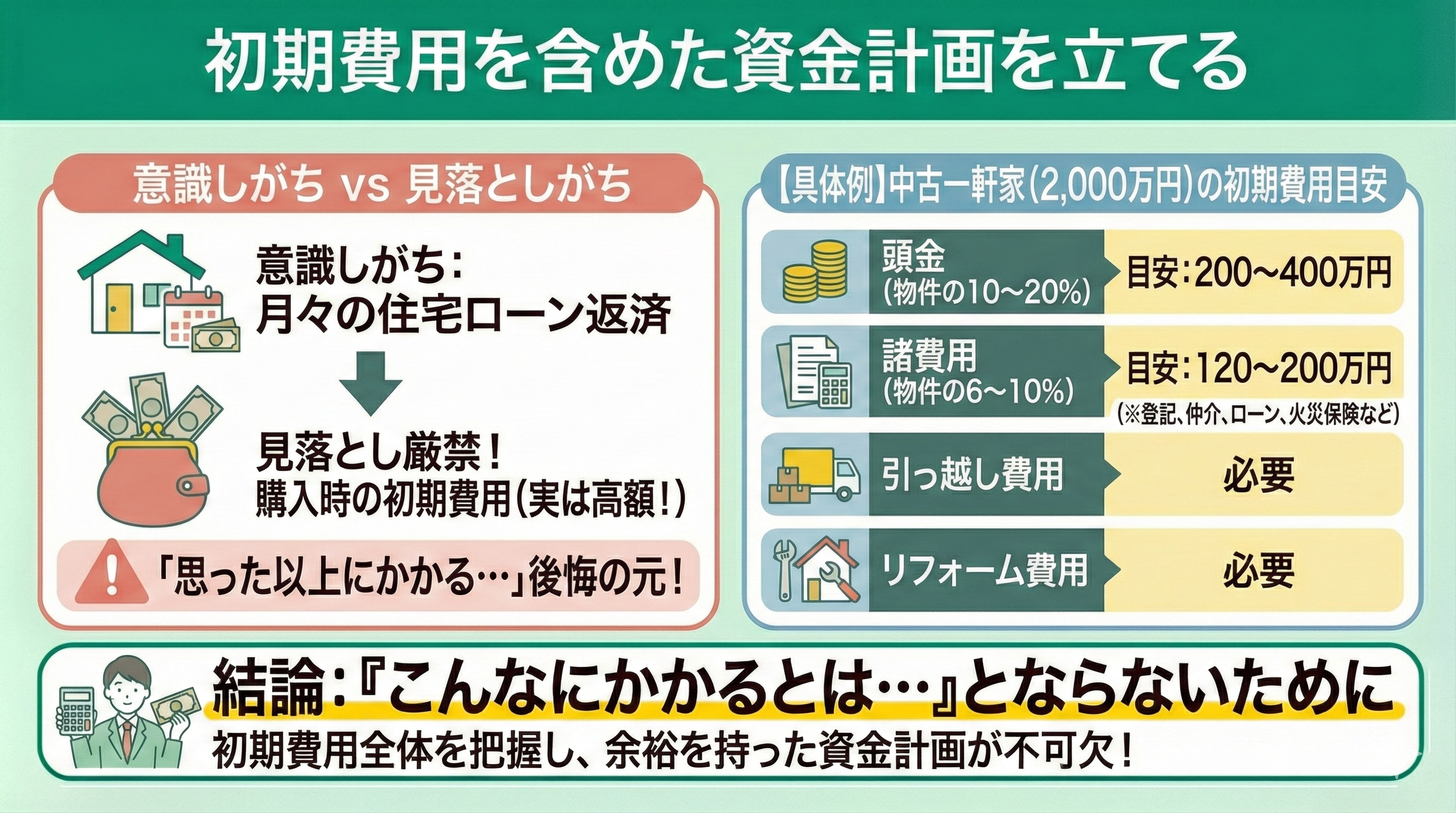 何も考えずに家を買うと「思った以上にお金がかかる…」と後悔します。中古の一軒家を購入する場合「頭金」「諸費用」「引っ越し費用」「リフォーム費用」などが必要です。