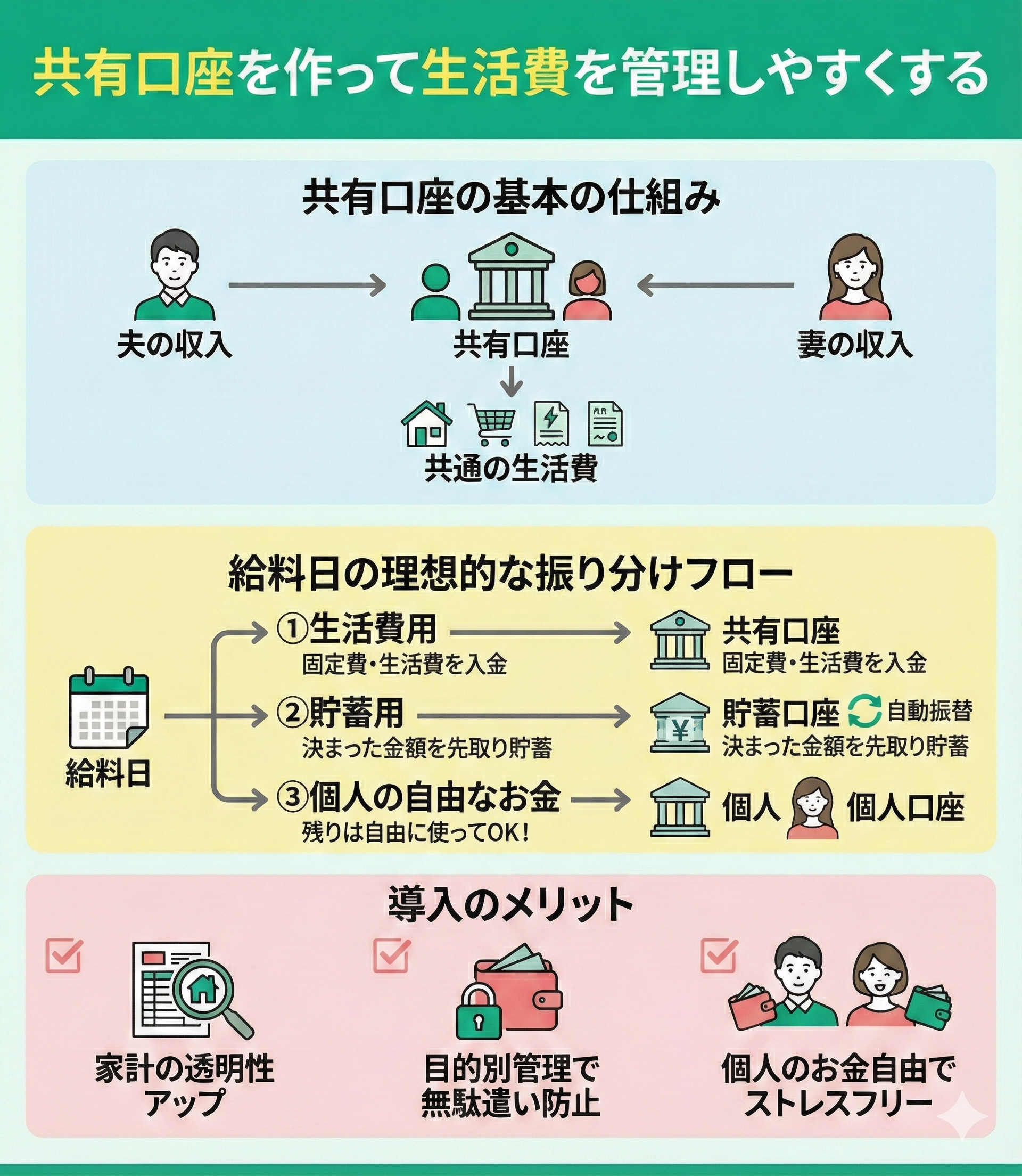 - 共有口座を作って生活費を管理しやすくする