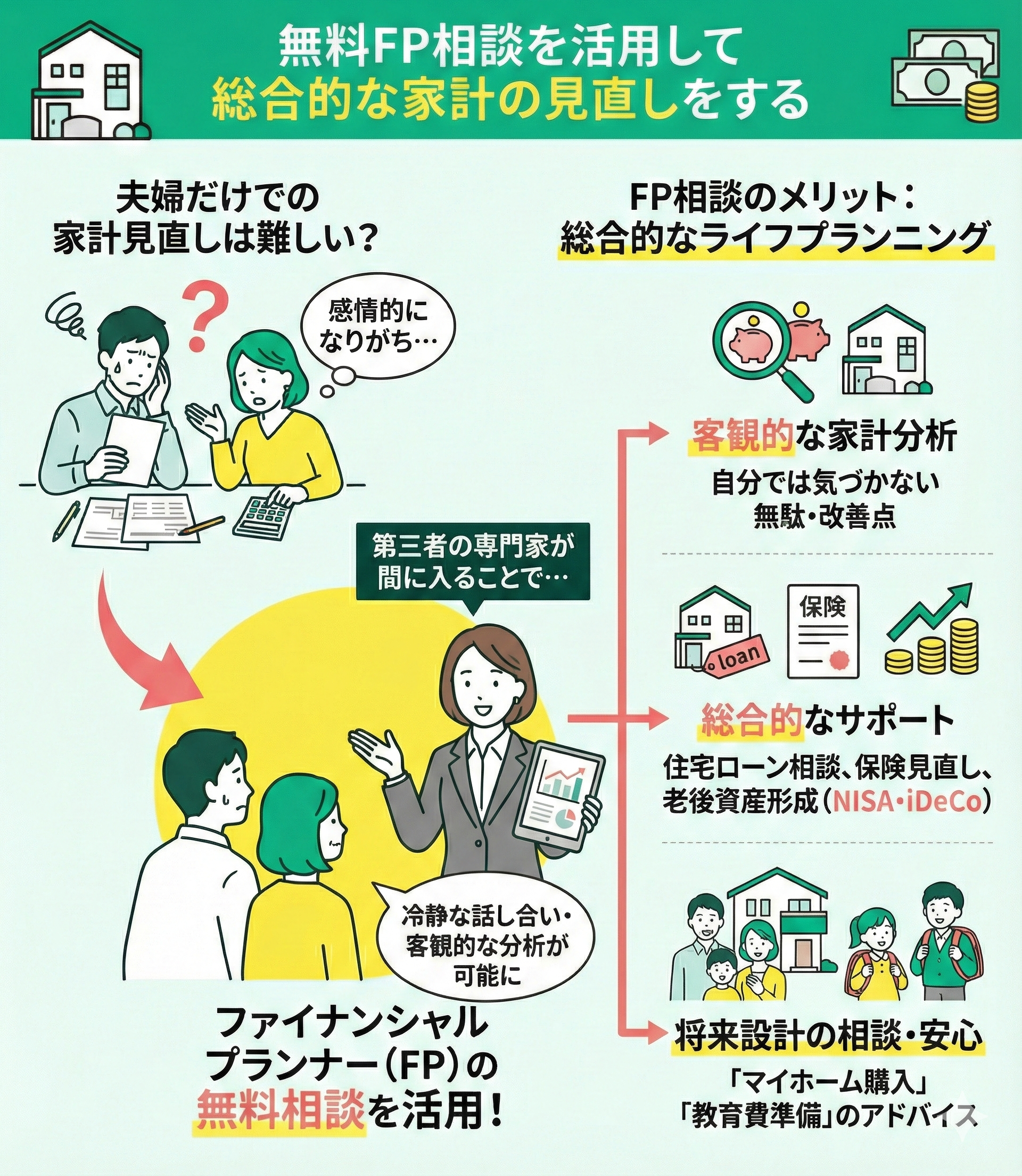 FPは単なる家計の見直しだけでなく、住宅ローンの相談や保険の見直し、老後に向けた資産形成(NISAやiDeCoの効果的な活用方法)など、総合的なライフプランニングをサポートしてくれます。