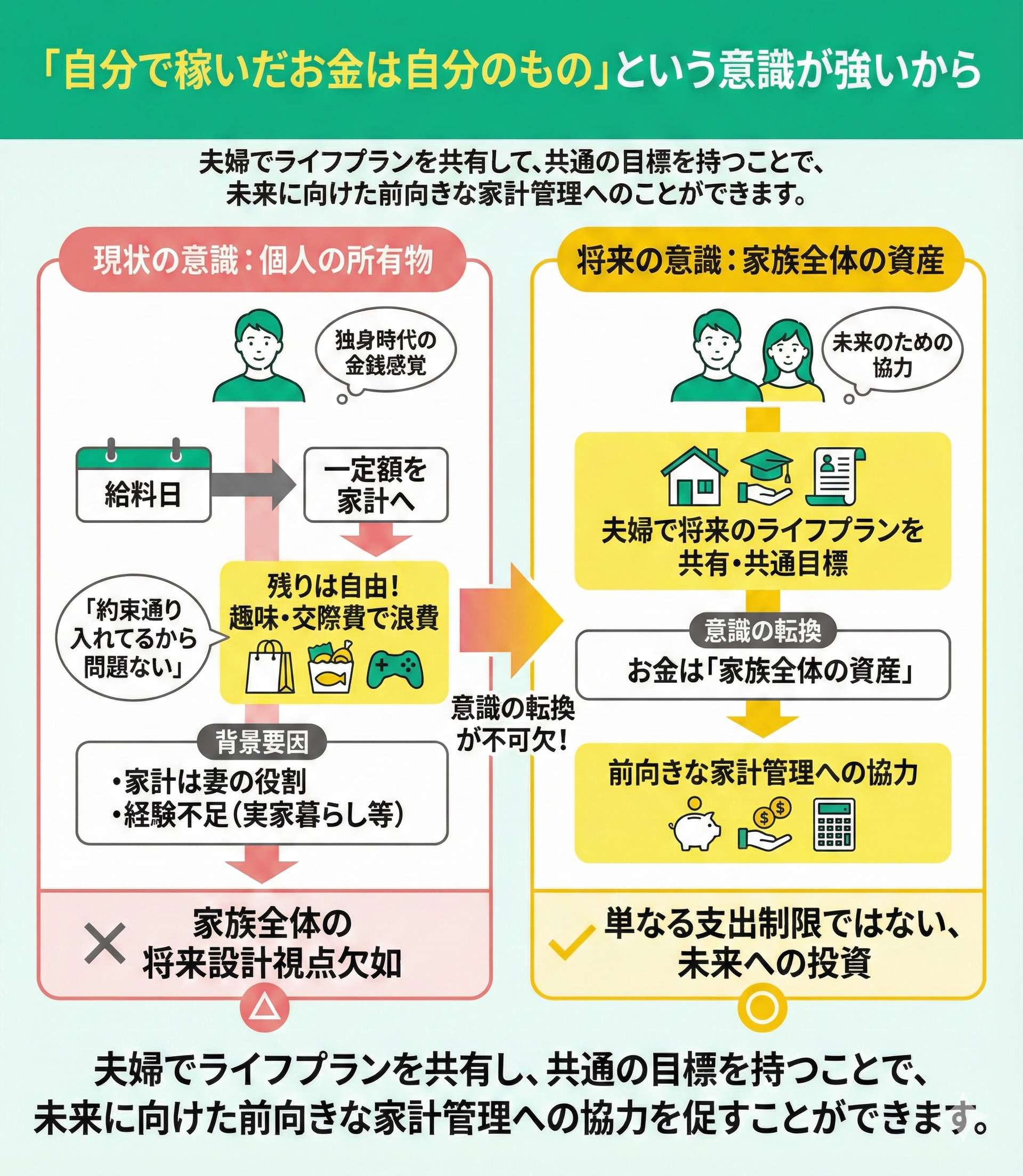 この考え方の根底には「家計に一定額を渡せば、残りは自由に使える」という認識があり、家族全体の将来設計という視点が欠如しています。