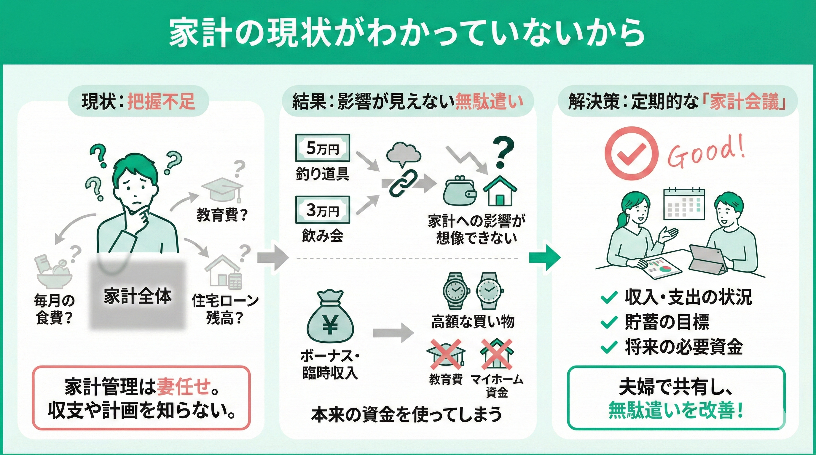 - 【まとめ】浪費の改善には話し合いが必須!プロと一緒に自分たちに合った解決策を見つけよう