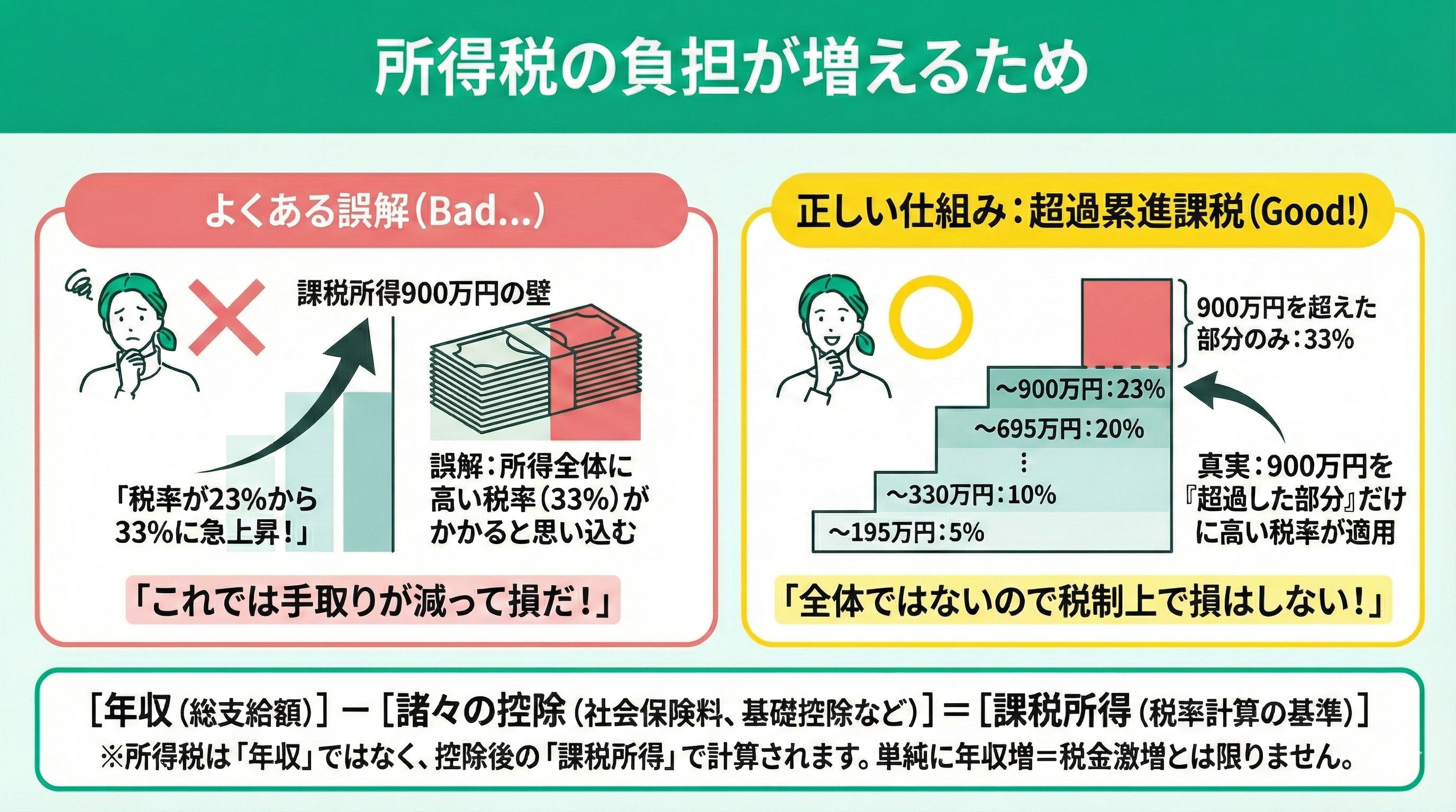 つまり、「課税所得が900万円以上となると所得全体に高い税率が適用される」という認識は誤り。正しくは「900万円を超過した部分に高い税率が適用される」。