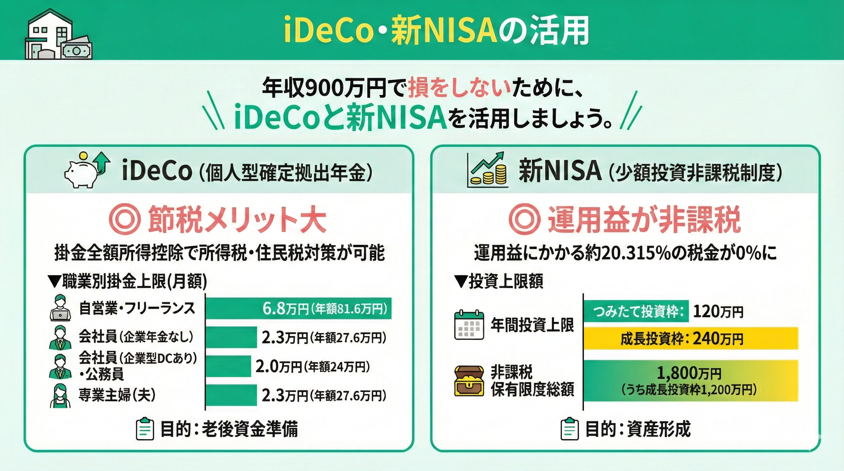 年収900万円で損をしないために、iDeCo・新NISAを活用しましょう。
