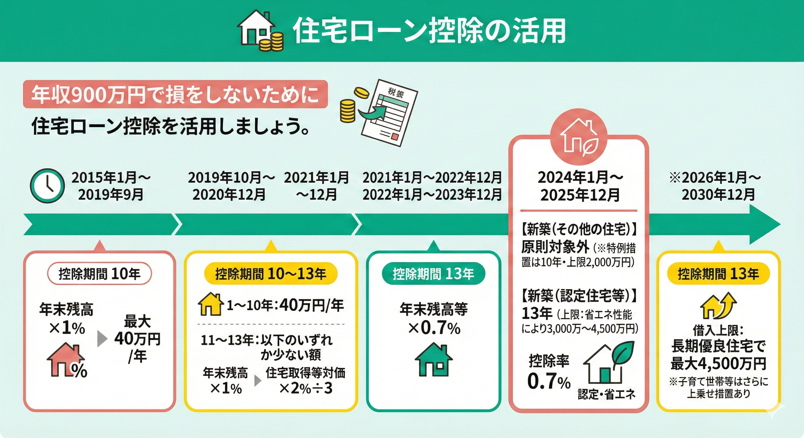 | 2026年1月1日〜 2030年12月31日 | 13年 | 借入上限:長期優良住宅で最大4,500万円 子育て世帯等はさらに上乗せ措置あり |