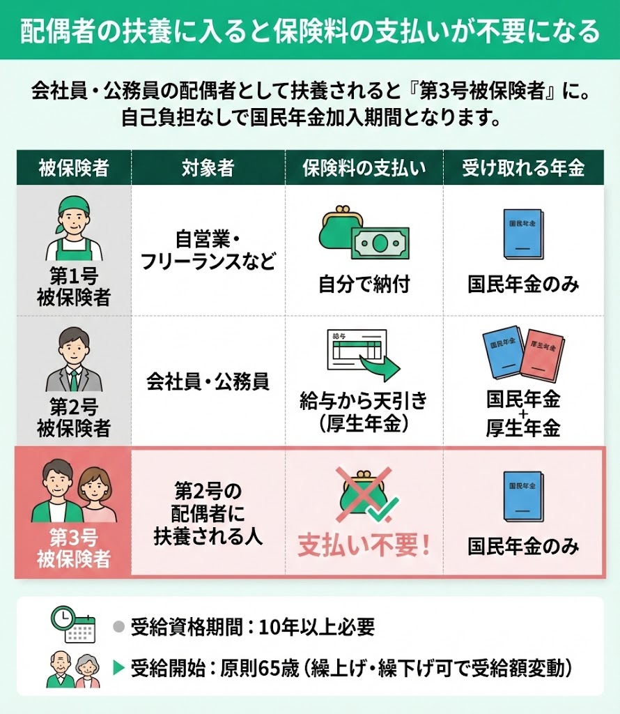 | 第3号被保険者 | 会社員・公務員の配偶者に 扶養される人 | 保険料の支払い不要 (配偶者が負担) | 受け取れる年金は 国民年金(基礎年金)のみ |