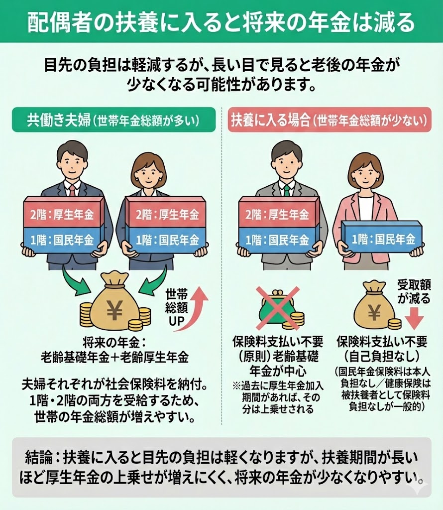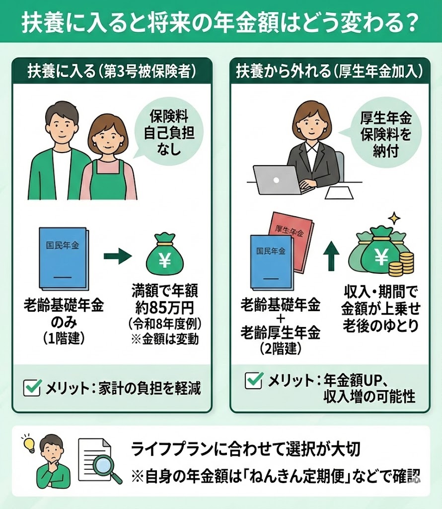 扶養に入るかどうかは、目先の手取りだけでなく、将来の年金(基礎年金+厚生年金の有無)や家計全体のキャッシュフローに影響します。