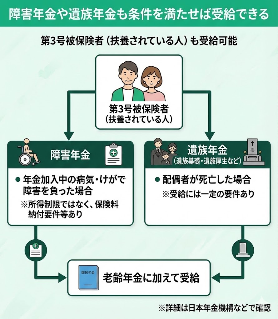 - 障害年金や遺族年金も条件を満たせば受給できる
