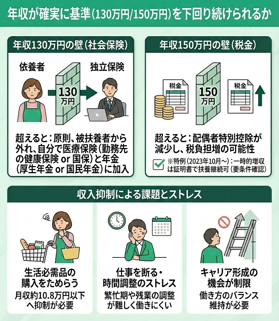 - 年収130万円の壁…年収が130万円を超えると、原則として配偶者の扶養から外れ、自分で社会保険(国保・国民年金/または勤務先社保)へ加入する必要があります。