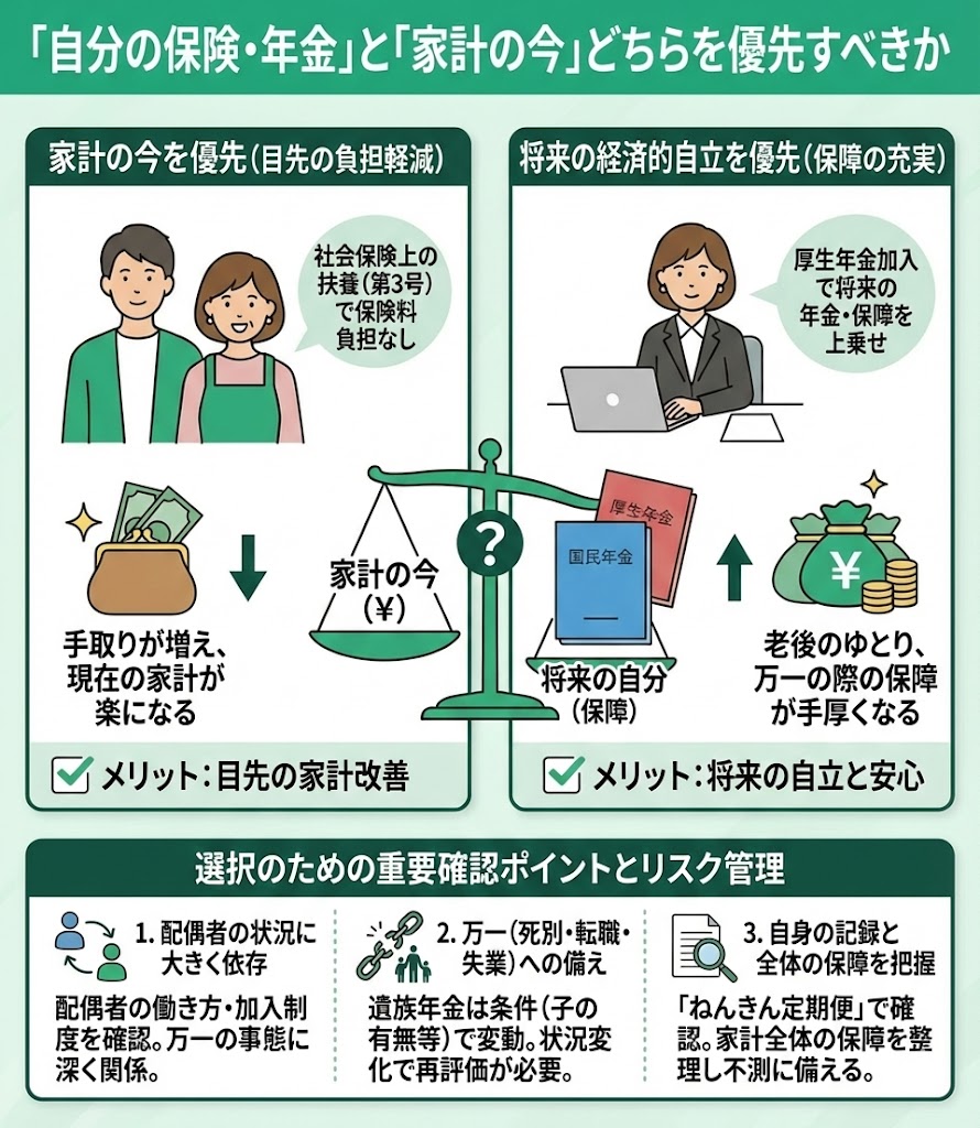 扶養に入るか迷った際には、現在の「目先の家計改善」と将来の「自身の保険や年金の経済的自立」のどちらを優先すべきかを視野に入れ選択する必要があります。