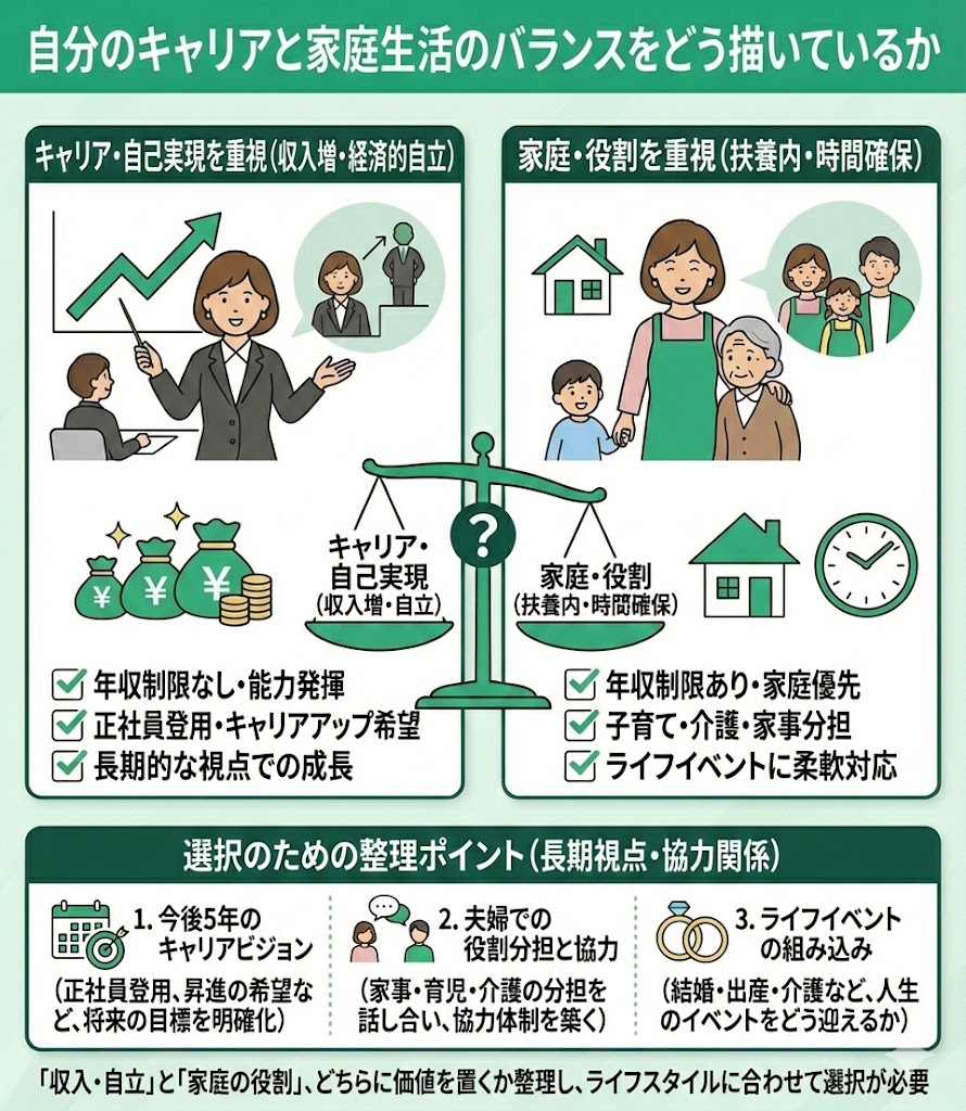 まずは、「収入を増やして経済的に自立する」ことと「家庭での役割を優先する」ことのどちらに価値を置くかを整理したうえで、扶養に入るかどうかを自身のライフスタイルに合わせて選択する必要があります。