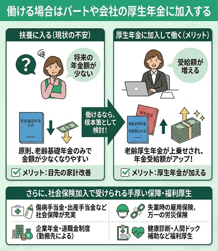 扶養に入ると将来受け取れる年金は原則として老齢基礎年金のみとなり、金額が少なくなりやすいです。働いて扶養を抜けて厚生年金に加入すれば、老齢厚生年金が上乗せされるため受給額が増えやすく、年金面では最も効果が出やすい根本策といえます。