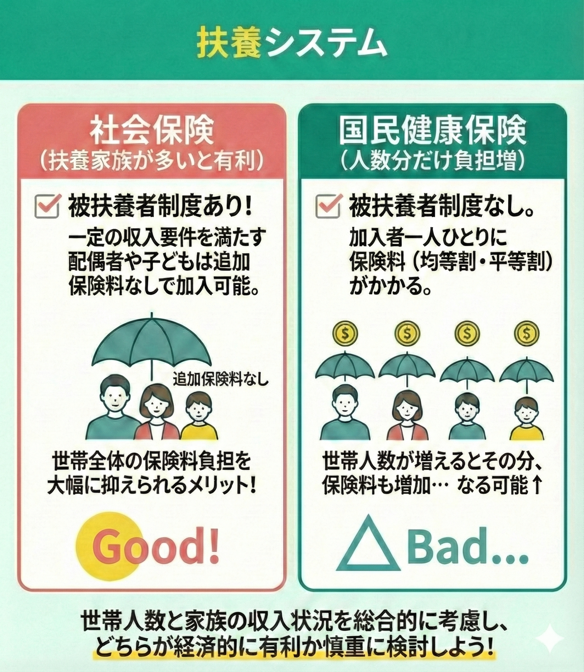 また、家計管理の面で見逃せないのが「扶養制度」の有無です。社会保険であれば、配偶者や子供を扶養に入れても追加の保険料は一切発生しません。