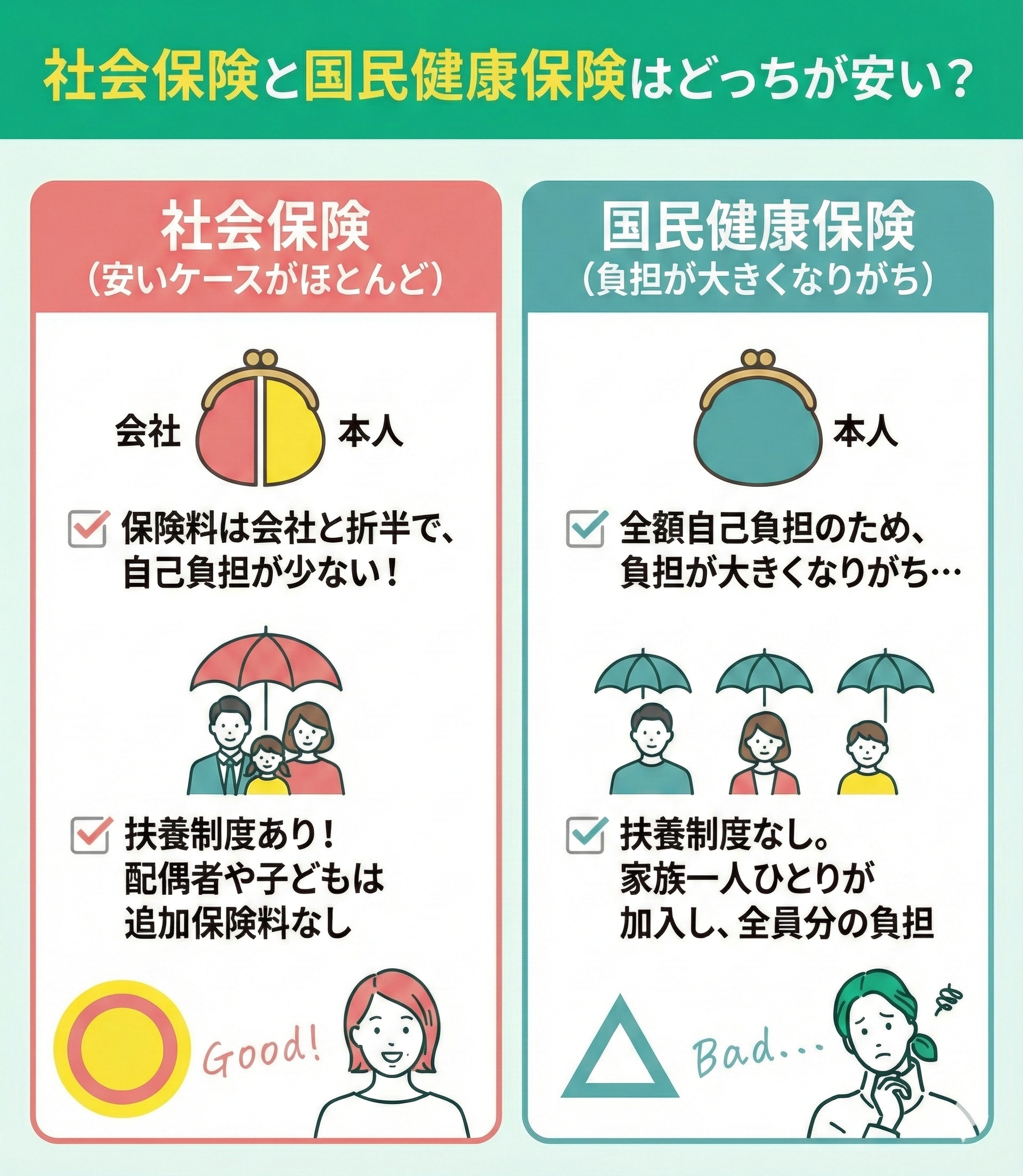会社員の方は会社が保険料の半分を払ってくれ、子どもは追加料金なしで保険に入れる社会保険が有利です。