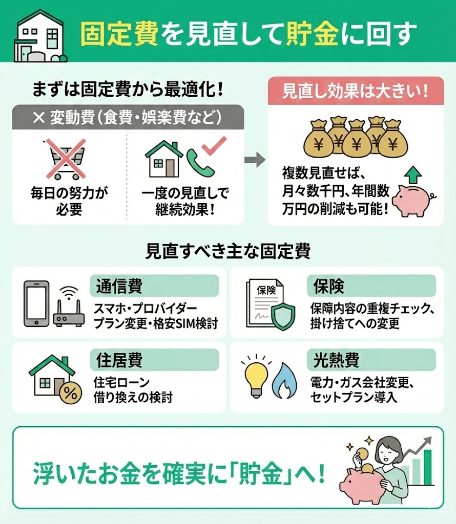 多くの人は食費や娯楽費といった変動費を節約しがちですが、固定費は一度見直せば継続的な節約効果が見込めます。