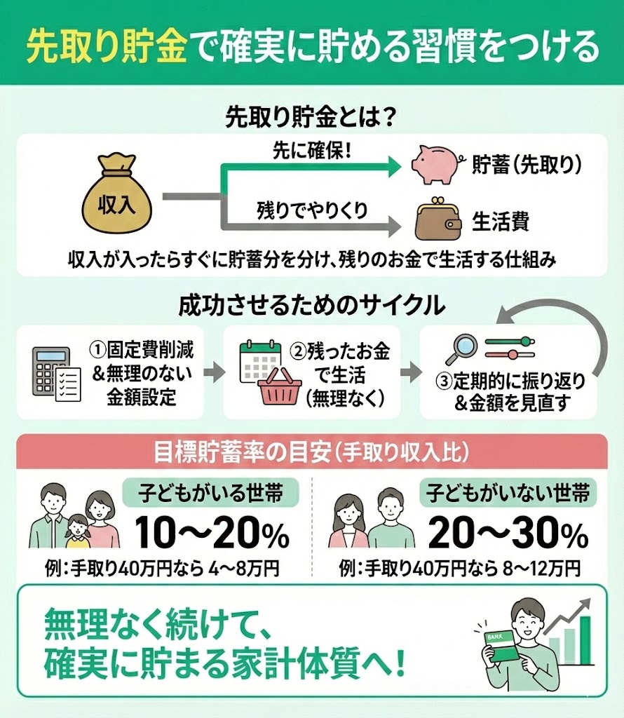 - 先取り貯金で確実に貯める習慣をつける
