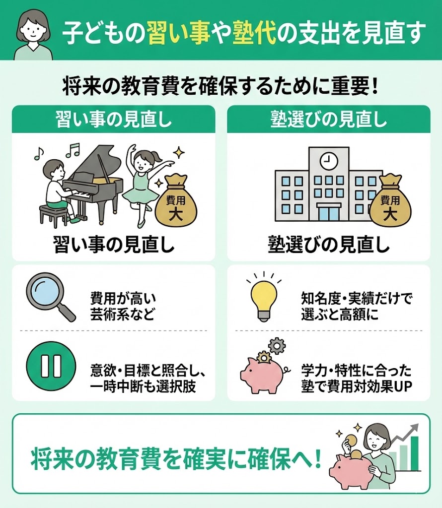 将来の教育費を確保するためには、子どもの習い事や塾代の支出を見直すことも重要です。