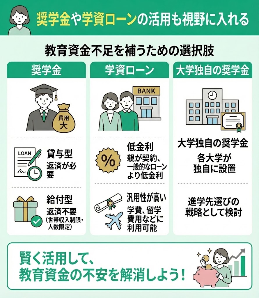 - 奨学金や学資ローンの活用も視野に入れる