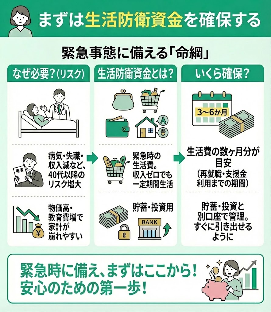 40代で貯金ゼロの場合、まずは「生活防衛資金」を確保してください。生活防衛資金とは、緊急事態にすぐに生活費として利用できるお金です。