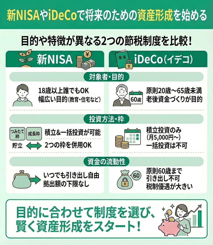 新NISAと、iDeCoはどちらも節税しながら投資ができる制度です。しかし、新NISAとiDeCoは目的や加入できる年齢が異なるので、違いを把握しておきましょう。
