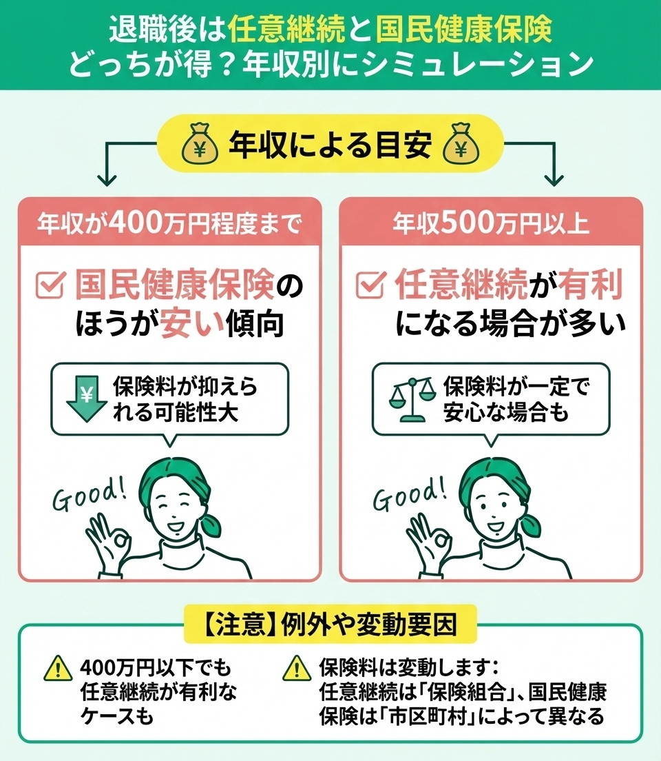 基本的には、年収が400万円程度までなら国民健康保険のほうが安くなり、年収500万円以上だと、任意継続が有利になる場合が多いです。