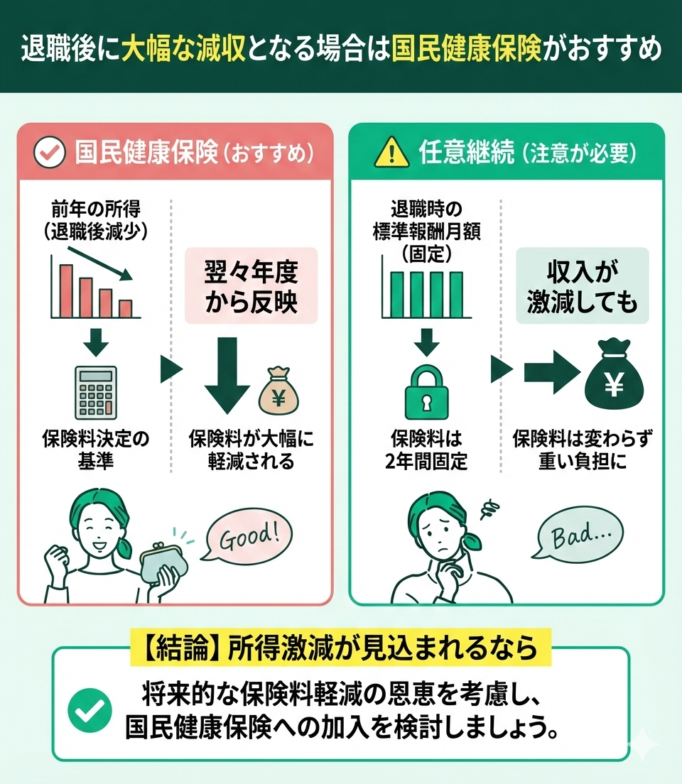 退職に伴い所得が激減する見込みであれば、国民健康保険の選択が有利です。