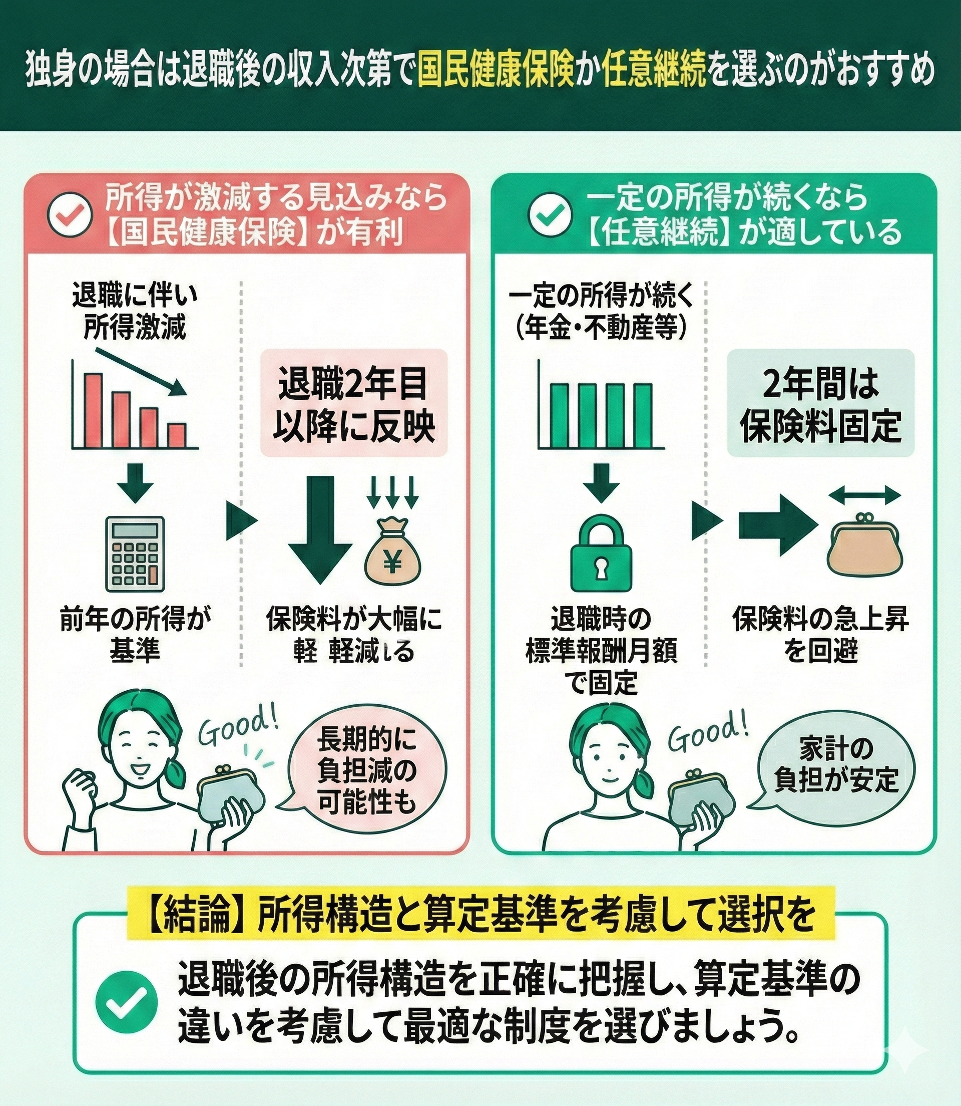 独身の場合は、退職後の収入次第で国民健康保険か任意継続を選ぶのがおすすめです。