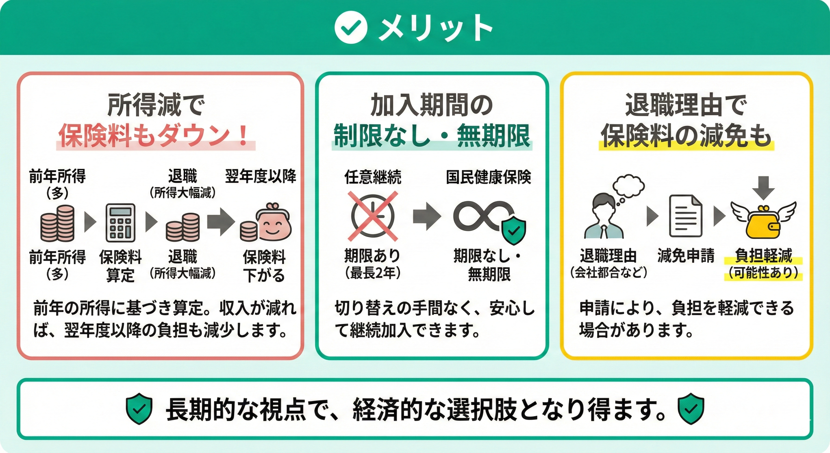 また、任意継続とは異なり、国民健康保険には加入期間の制限がありません。保険の切り替え手続きの必要なく、無期限に継続加入できるため保険資格の安定性が保たれます。