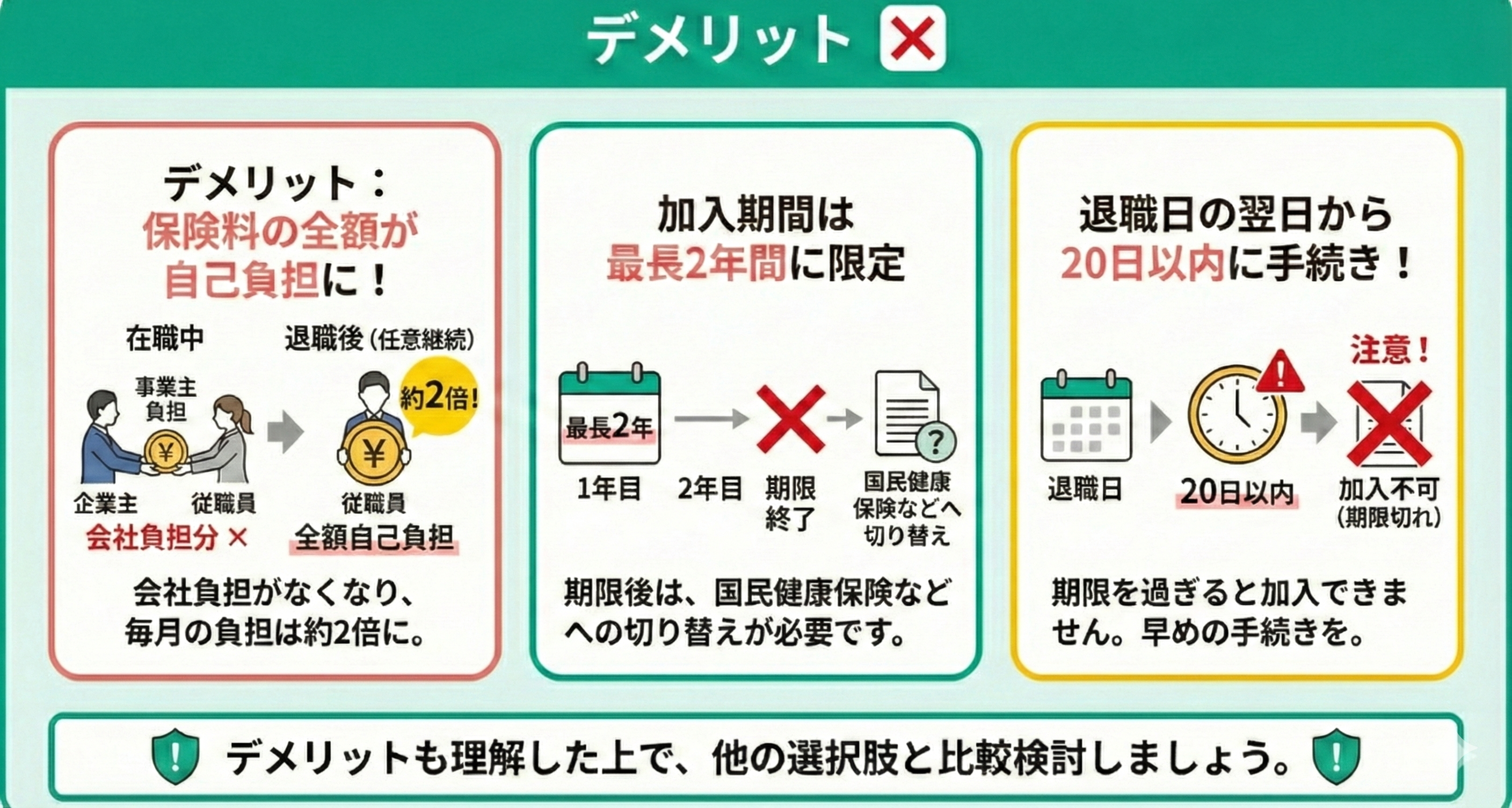 デメリットは、在職中に会社が負担していた保険料の事業主負担分がなくなり、保険料の全額を自己負担しなければならない点です。