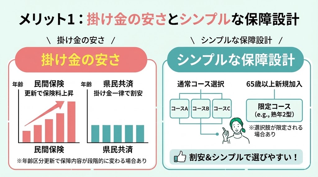 65歳以上の方が県民共済を選ぶ1つめのメリットは、掛け金の安さとシンプルな保障設計です。
