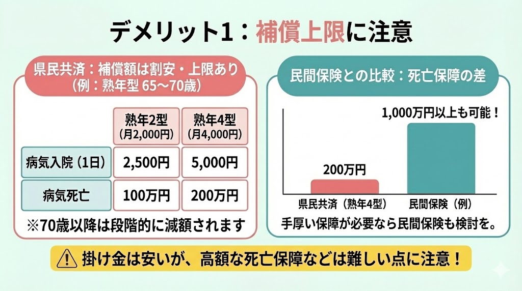 65歳が県民共済を選ぶ1つめのデメリットは、補償額に上限があることです。