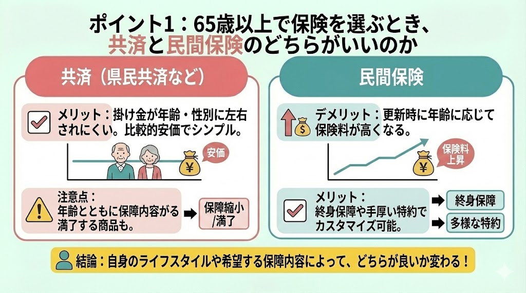 ポイント1:65歳以上で保険を選ぶとき、共済と民間保険のどちらがいいのか