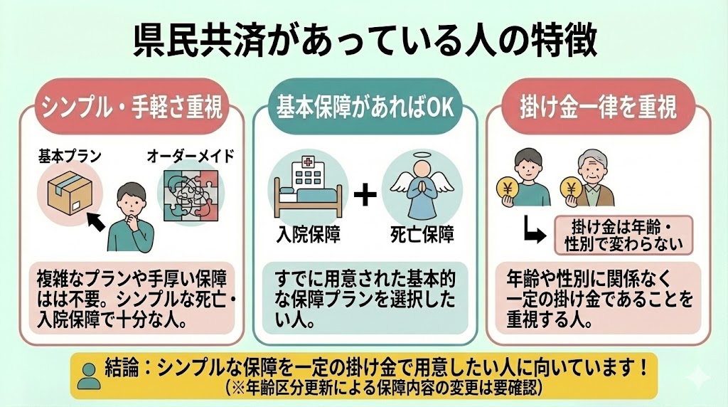 県民共済があっている人の特徴をまとめると、以下のとおりです。