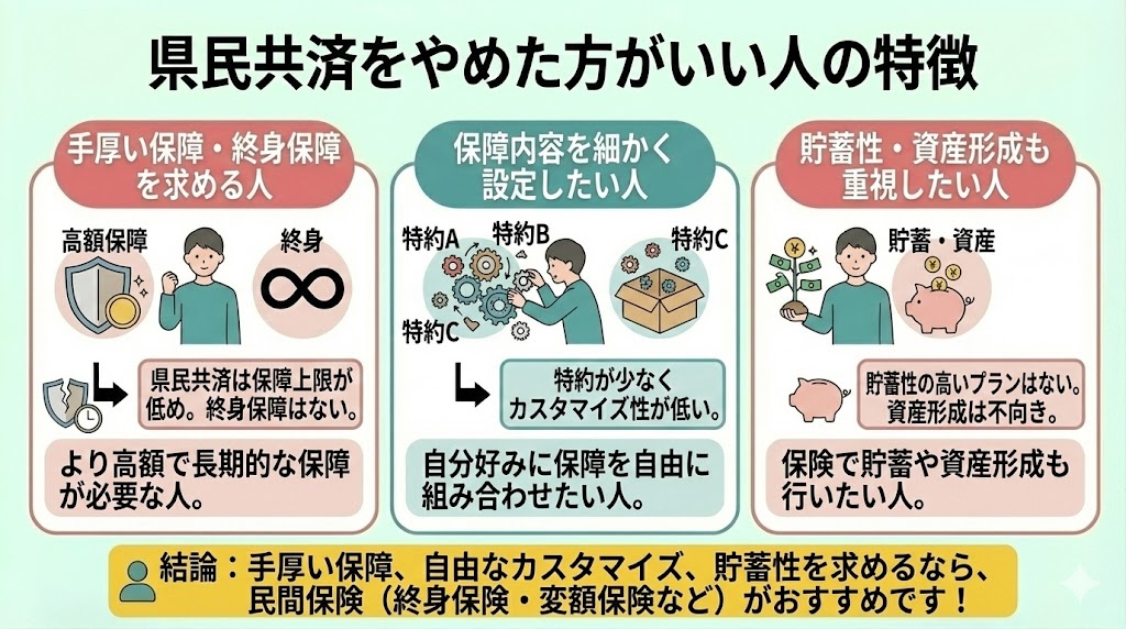 県民共済をやめたほうがいい人の特徴をまとめると、以下のとおりです。