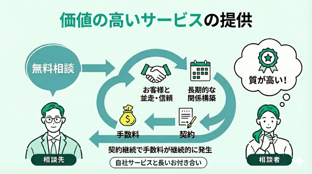 しかし、その手数料は「契約を続けていただく」ことによって継続的に受けとることができるのです。
