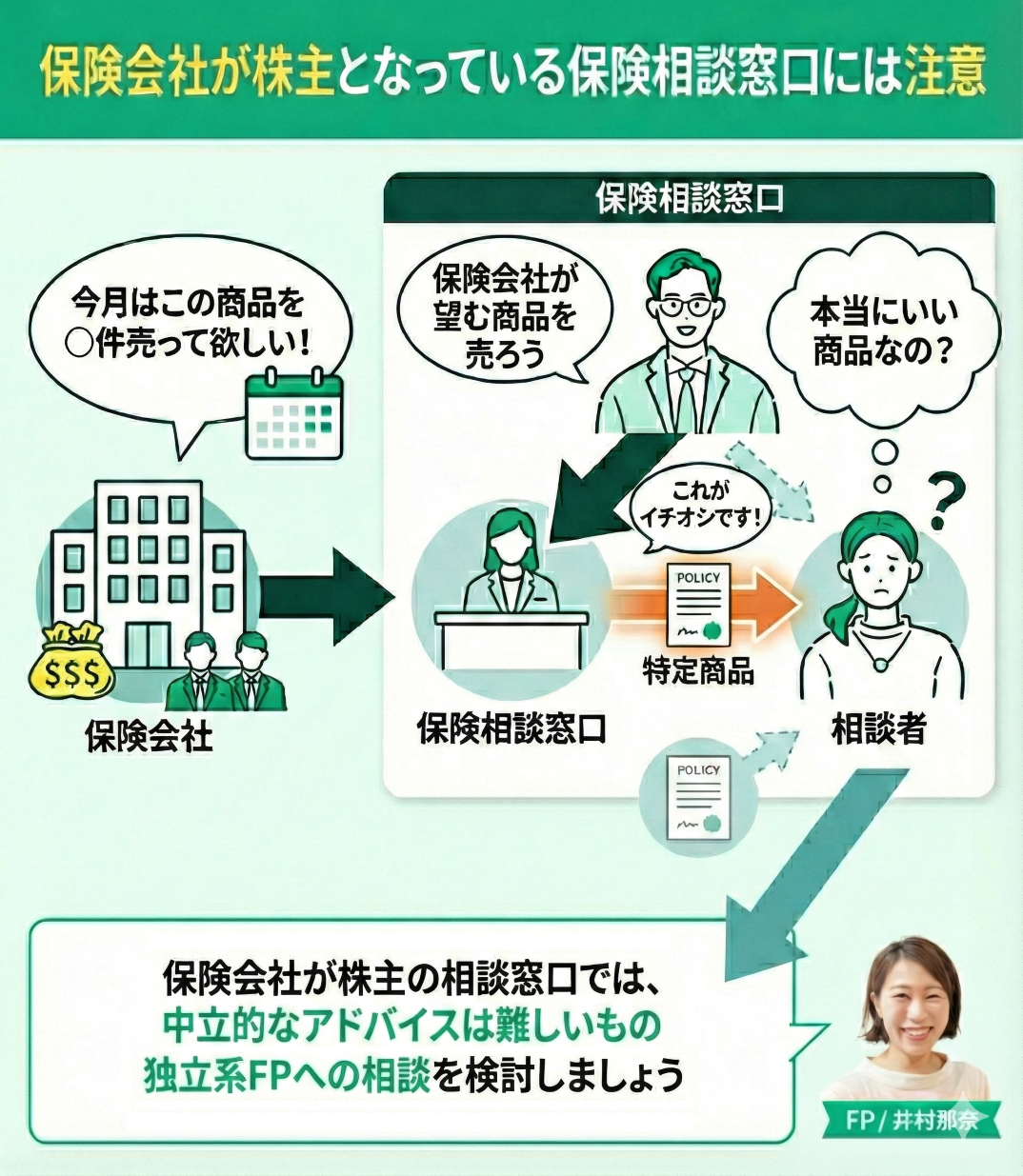大規模に運営している保険相談窓口の多くは保険会社が株主となっています。相談窓口には各保険会社から「今月はこの商品を何件売って欲しい」という要請が来ます。