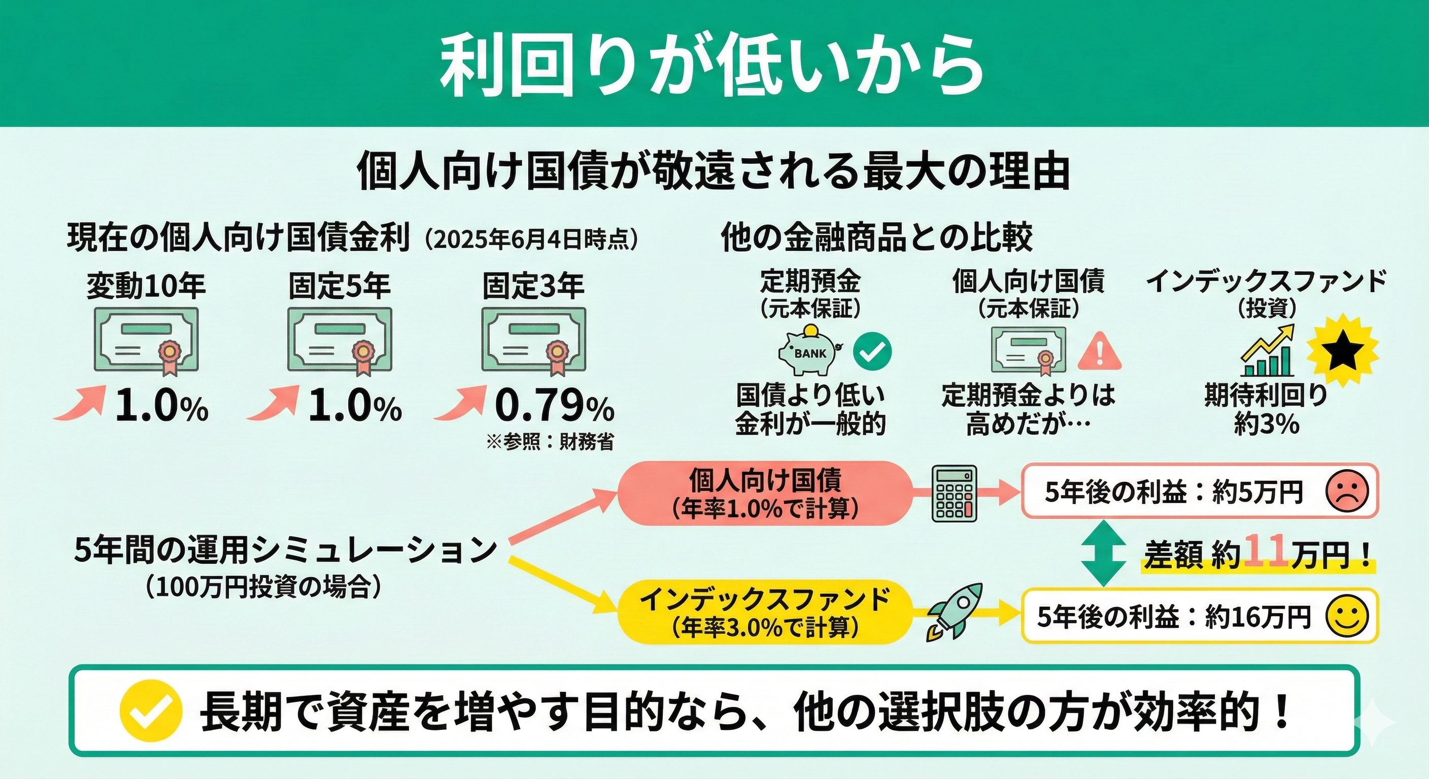 個人向け国債が「避けるべき」とされるのは、低利回りやインフレへの弱さがあるからです。しかし、元本保証の安心感は、着実な資産形成を望む方には大きな魅力でもあります。