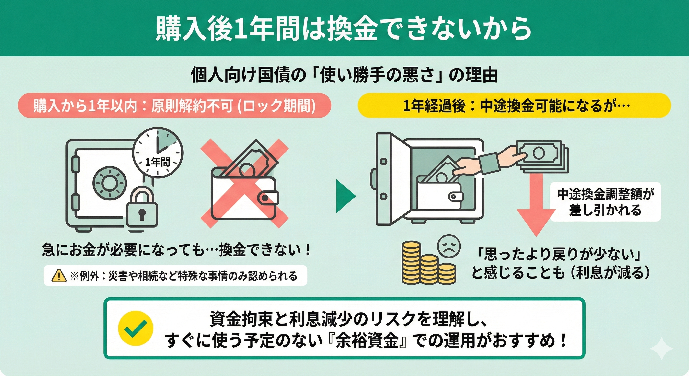 個人向け国債は購入から1年間、原則として解約できません。 この「ロック期間」の存在が、使い勝手の悪さにつながっています。