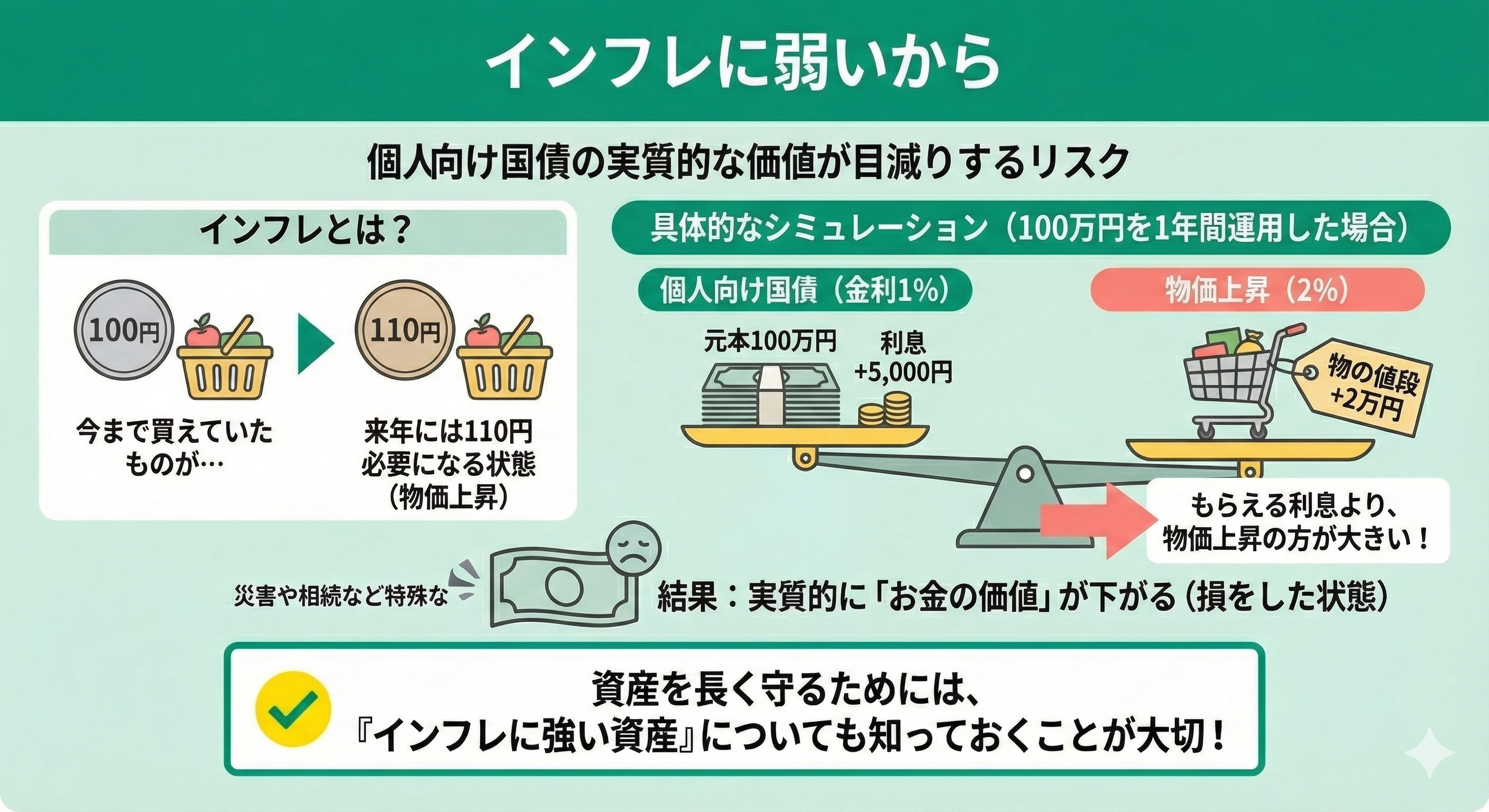 個人向け国債は元本が保証される安心感がある一方で、物価の上昇に対して強いとは言えません。資産を長く守っていくためには、「インフレに強い資産」についても知っておくことが大切です。