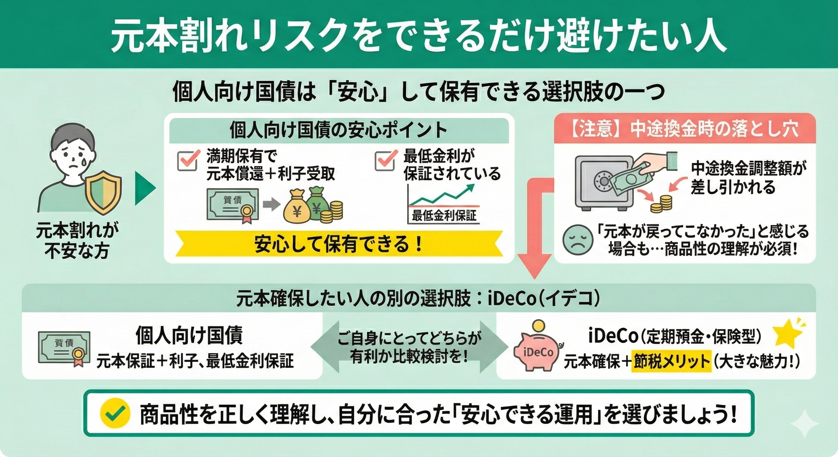 元本を確保しながら資産運用したい方には、iDeCoで定期預金や保険型商品を選ぶという選択肢もあります。iDeCoなら節税メリットも受けられるため、ご自身にとってどちらが有利か比較してみてください。