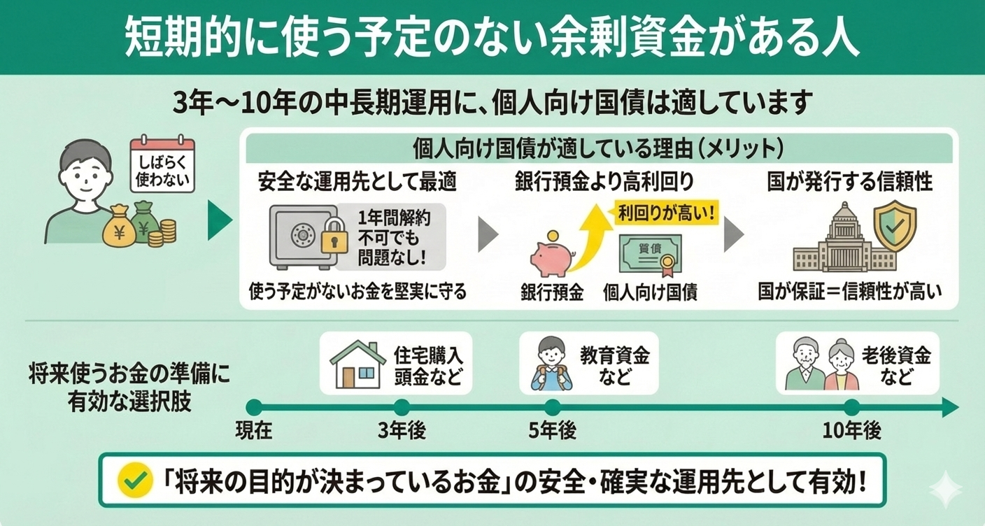 余剰資金を3年〜10年といった中長期で運用できる方にも、個人向け国債は適しています。