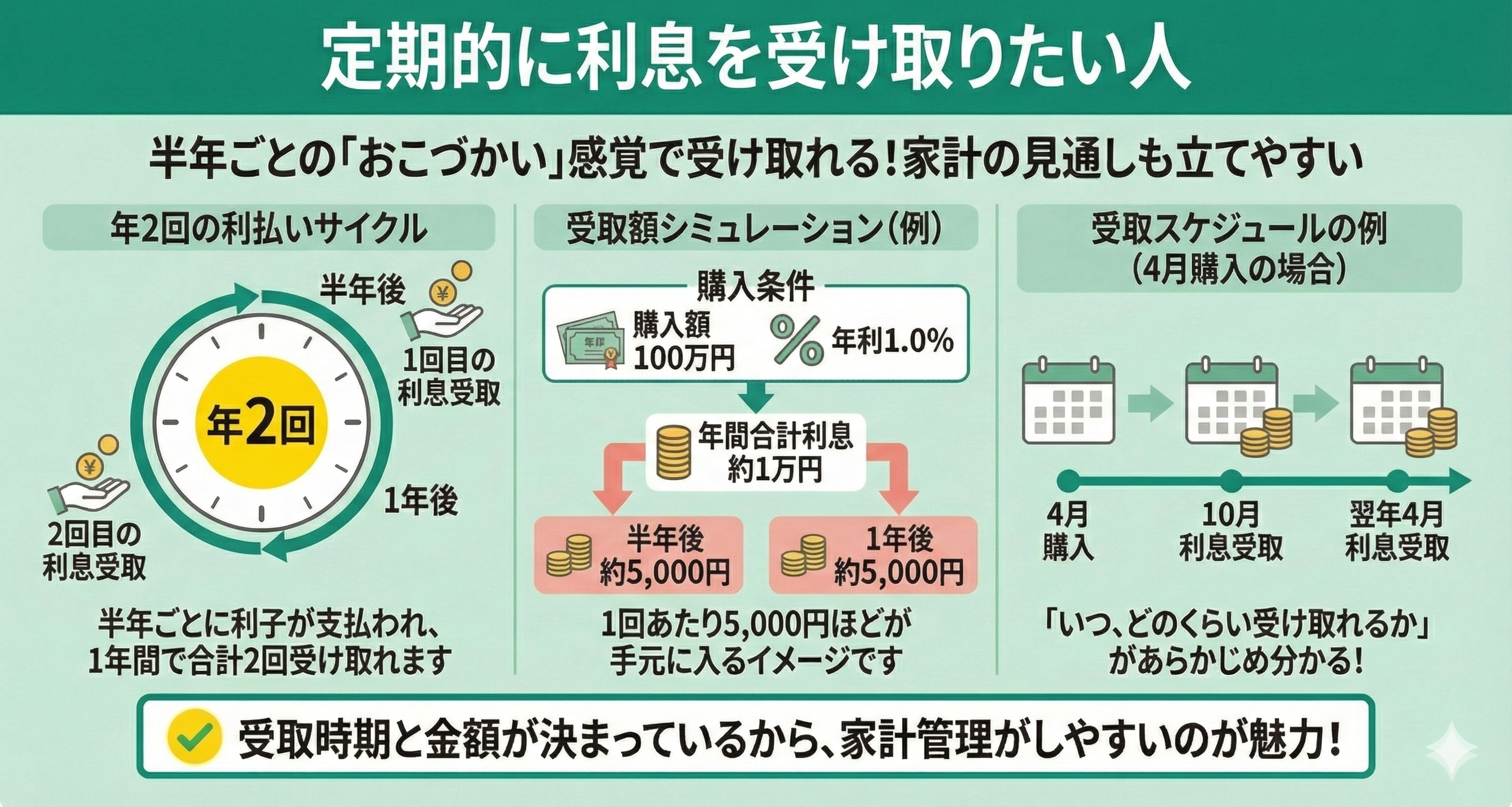 支払いのタイミングは購入月によって決まり、4月に買えば、10月と翌年の4月に受け取ることになります。「いつ、どのくらい受け取れるか」があらかじめ分かるため、家計の見通しも立てやすいのが魅力です。
