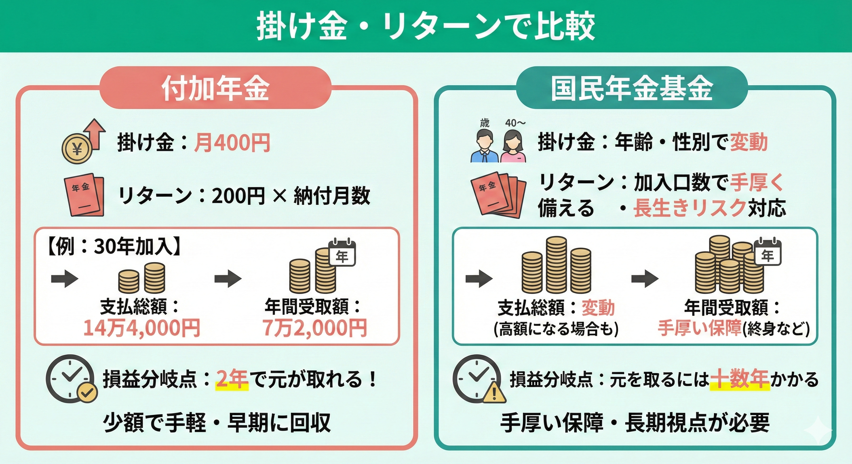 以下で付加年金と国民年金基金はどっちが得なのか、3つのポイントで比較していきます。