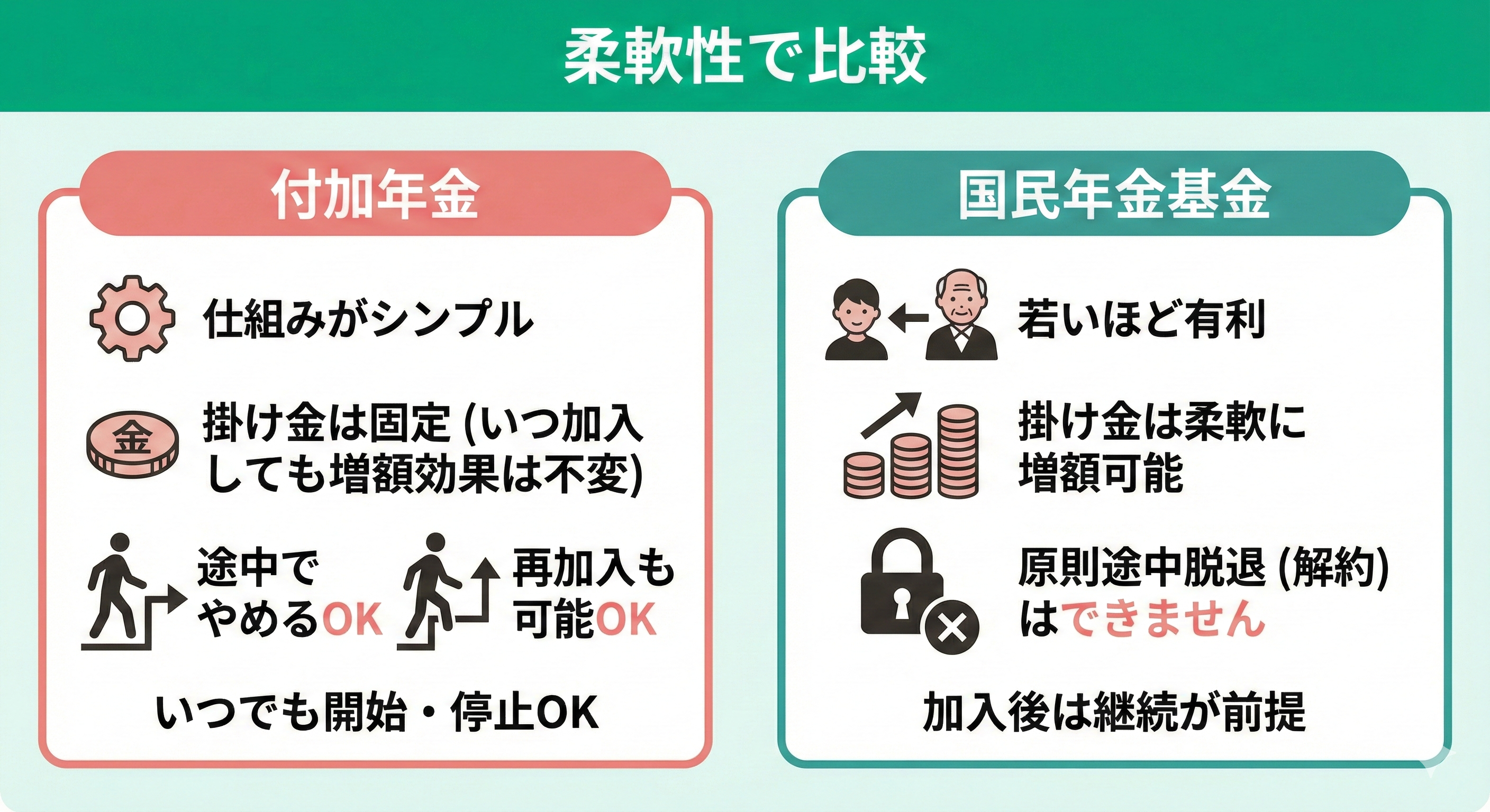 付加年金と国民年金基金はどっちが得なのか、柔軟性で比較します。