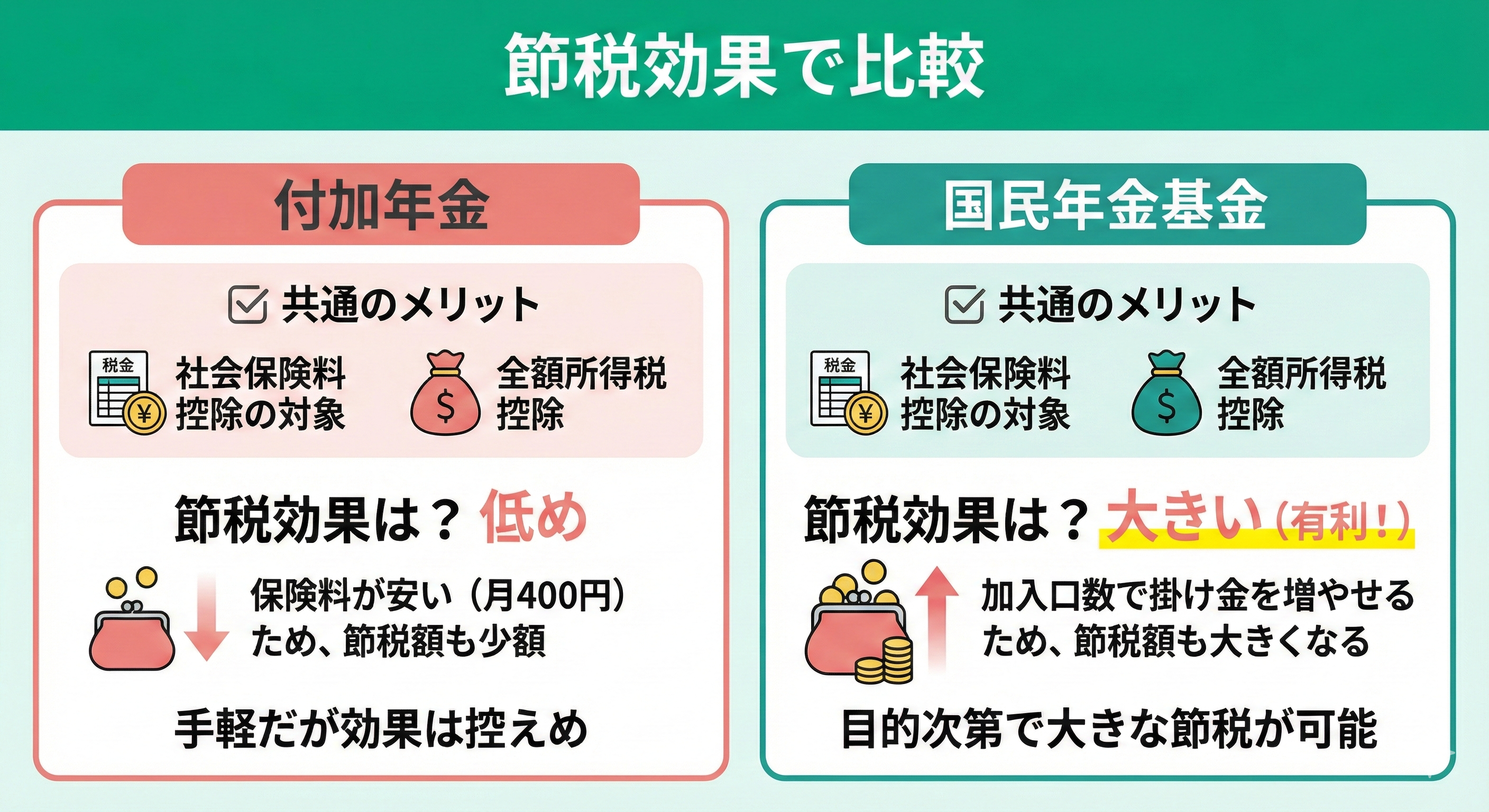 付加年金と国民年金基金はどっちが得なのか、節税効果で比較します。